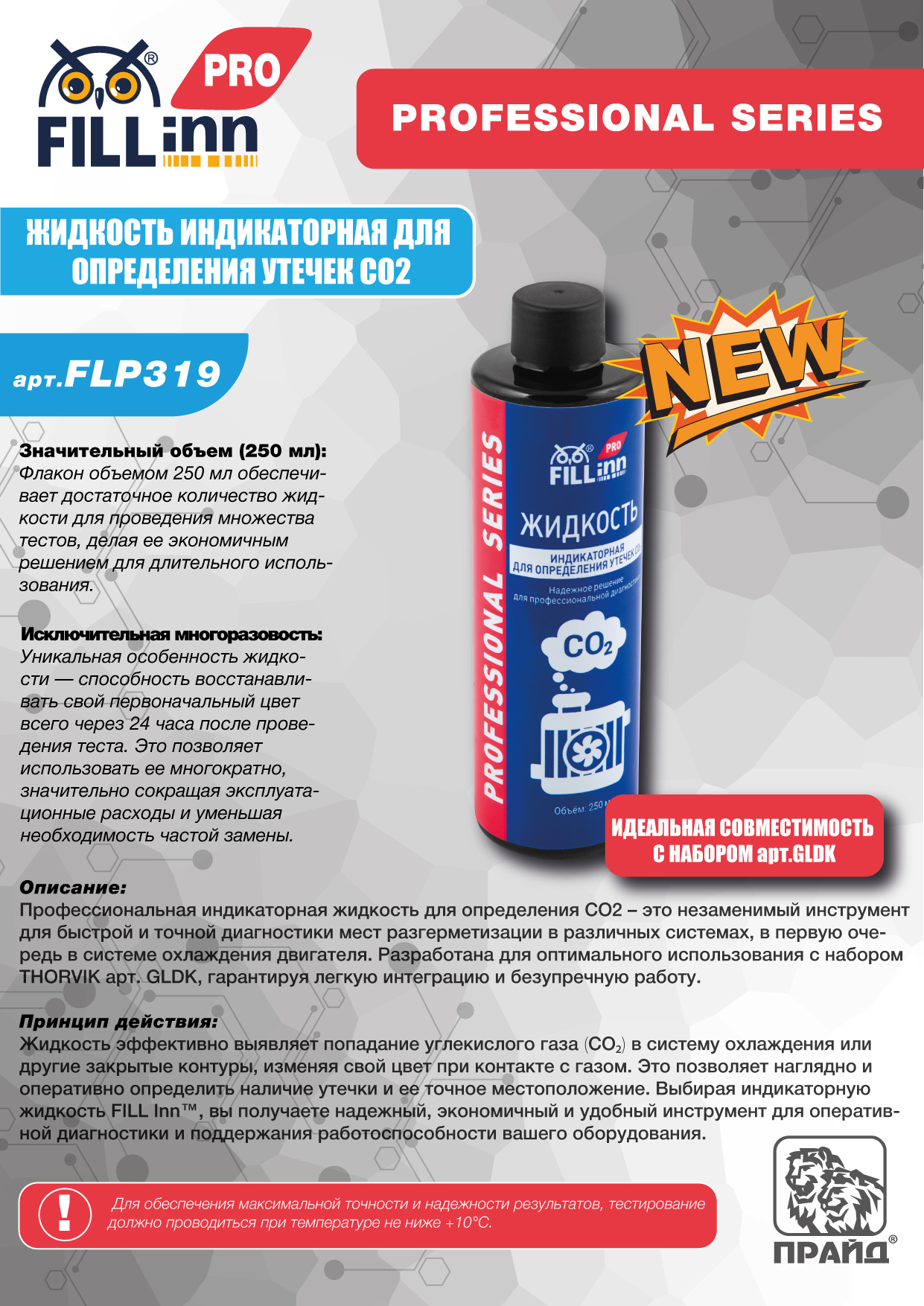 Жидкость эффективно выявляет попадание углекислого газа (CO) в систему охлаждения или другие закрытые контуры, изменяя свой цвет при контакте с газом. Это позволяет наглядно и оперативно определить наличие утечки и ее точное местоположение. Выбирая индикаторную жидкость FILL Inn™, вы получаете надежный, экономичный и удобный инструмент для оперативной диагностики и поддержания работоспособности вашего оборудования.